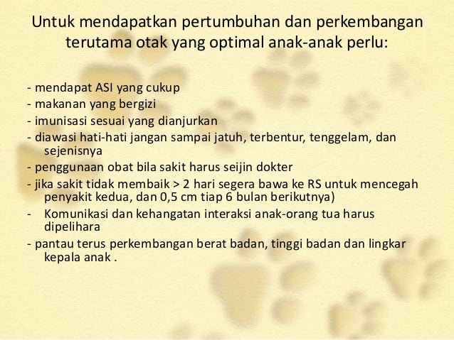 10 stimulasi untuk otak bayi ayahbunda.Id. Dan, faktanya, tak hanya asupan makanan yang berpengaruh pada tumbuh kembang otaknya, namun juga dari aktivitasaktivitas tertentu otak bayi pun dapat terstimulasi. Tumbuh kembang otak bayi pustaka digital ibu dan anak. Tumbuh kembang otak. Secara keseluruhan, otak si kecil saat lahir sudah terbagi menjadi empat bagian utama, yakni batang otak ( brainstem ), otak kecil ( serebelum ), otak besar ( serebrum) dan diensefalon. Berat otak bayi saat ini sudah mencapai 25%. Tumbuh kembang optimal, dengan stimulasi tepat nutrisi. Jika terdeteksi dini, penyimpangan tumbuh kembang dapat segera diperbaiki dengan berbagai intervensi. Sebaliknya, keterlambatan deteksi mempersulit koreksi, penyimpangan makin sukar diperbaiki. Kurun waktu masa 'anak' terbentang panjang. Sejak baru lahir, bayi hingga remaja, masih termasuk kategori anak (pediatrik). Peringatan hari prematur sedunia dukung bayi prematur. Orang tua bayi prematur harus memberikan perhatian khusus karena nanti bisa berdampak pada tumbuh kembang anak. Masa depan seorang anak dipengaruhi oleh 1000 hari pertama yang dimulai sejak masih di dalam kandungan, yaitu 270 hari. Cara merawat bayi prematur supaya tumbuh kembangnya optimal. Video acara bicara gizi nub tentang “dukung si kecil yang lahir prematur untuk tumbuh kembang optimal”. Semoga artikel ini bermanfaat ya, khususnya buat temanteman yang baru saja dikaruniai bayi.